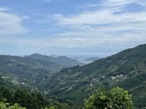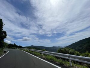「なんちゃらスカイライン」という名前が付きそうな道に、山の夏空が広がり、遠くには海と島が見えます。