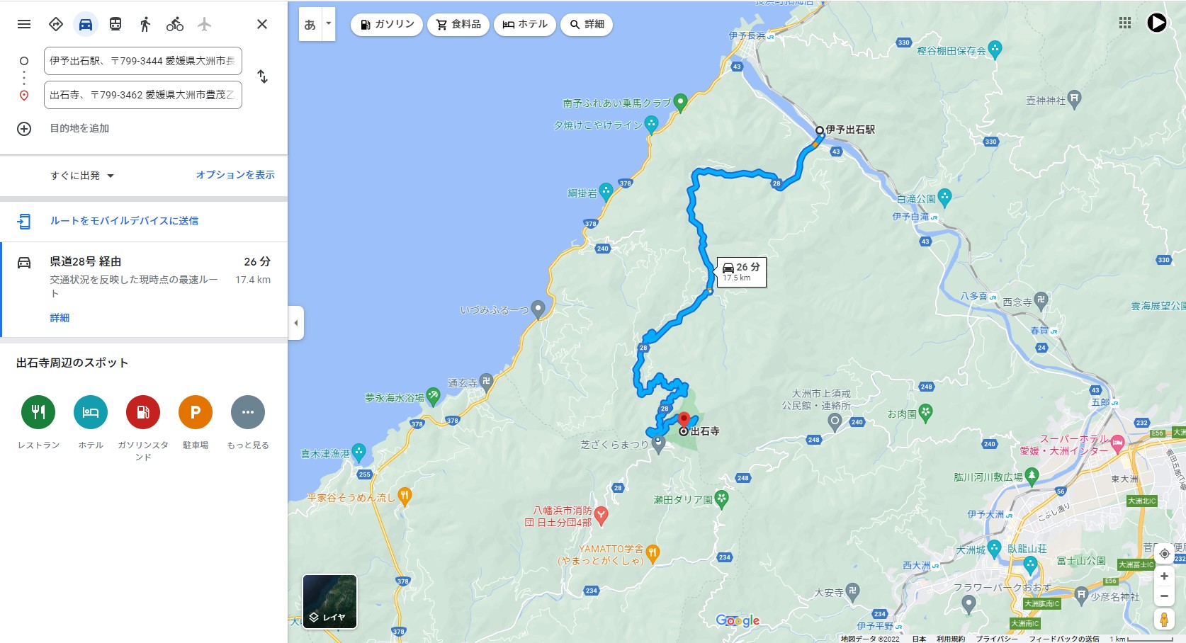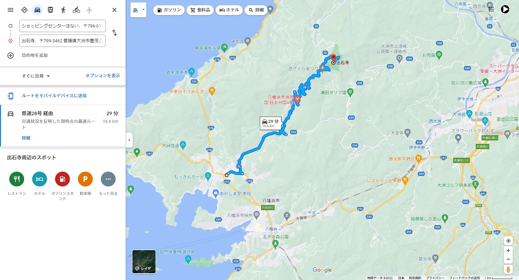 八幡浜市から愛媛県道28号長浜保内線を南から北に登っていくルート